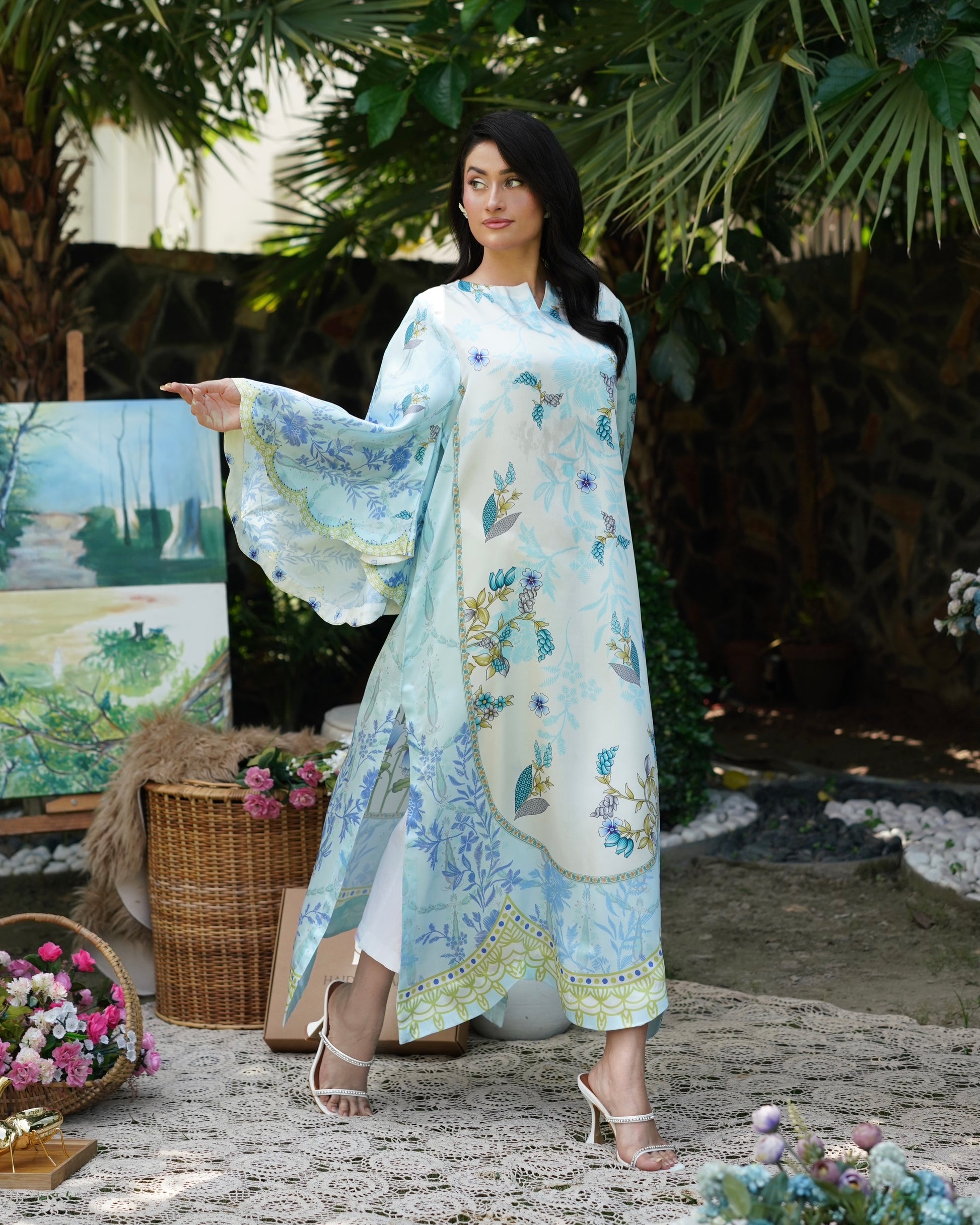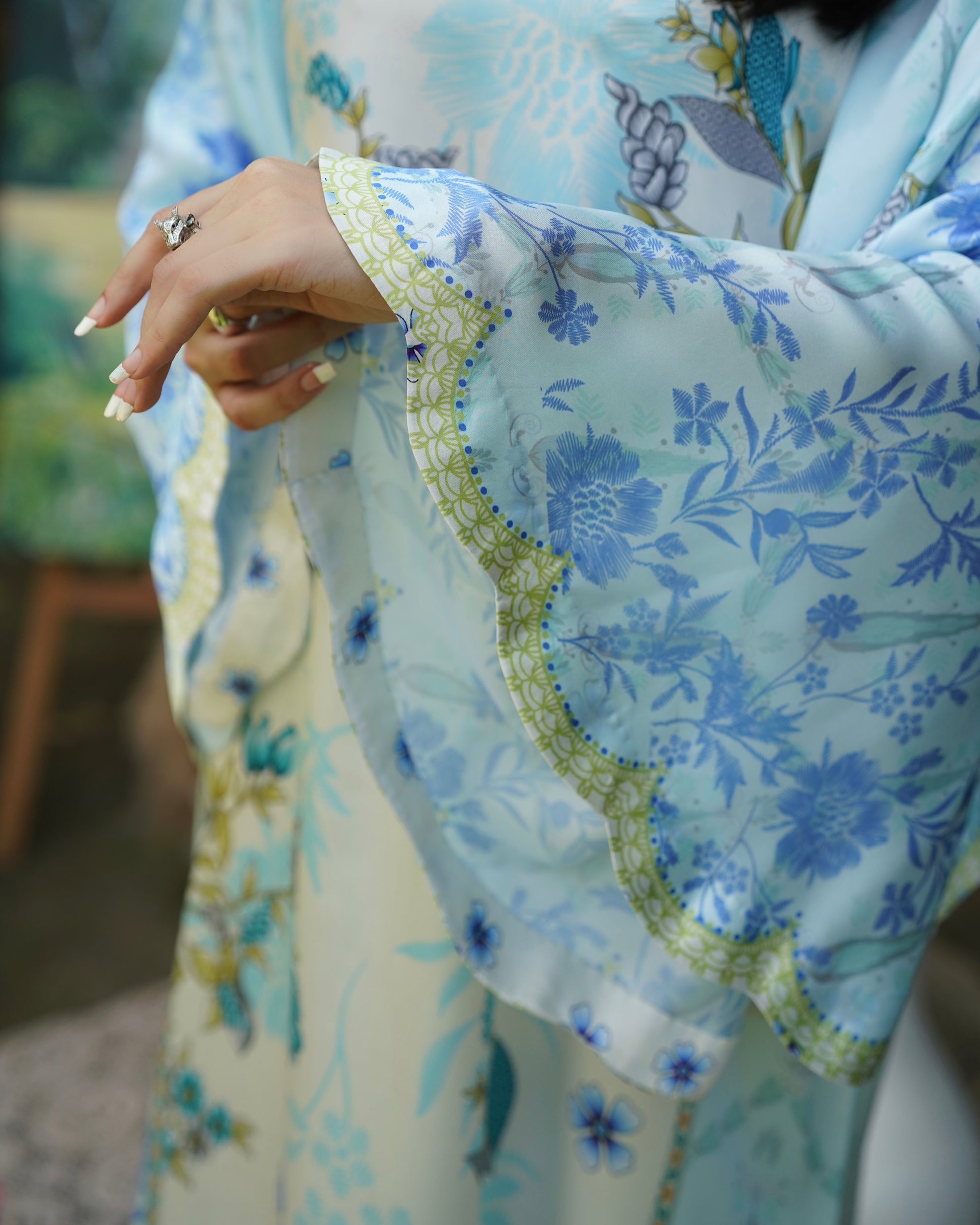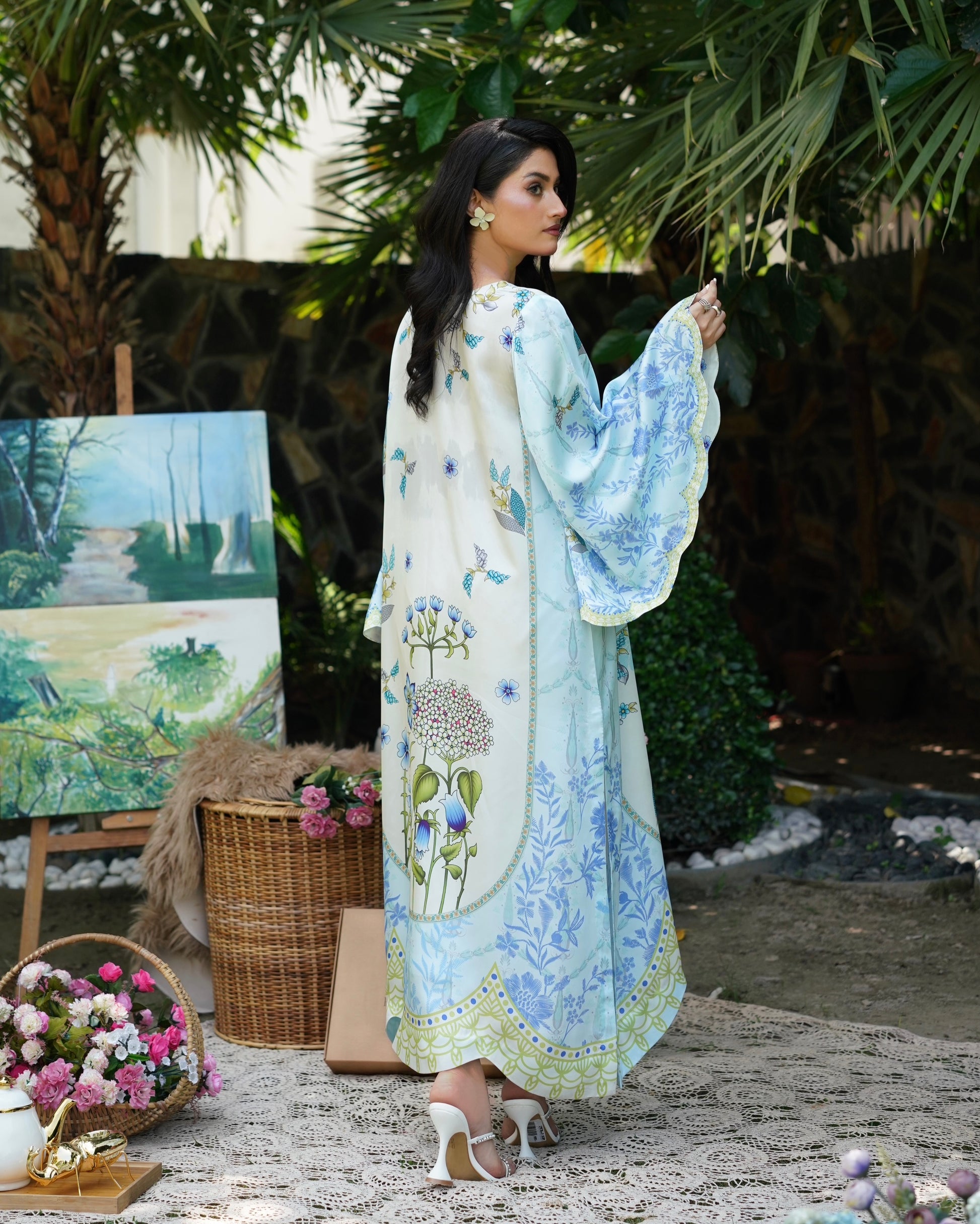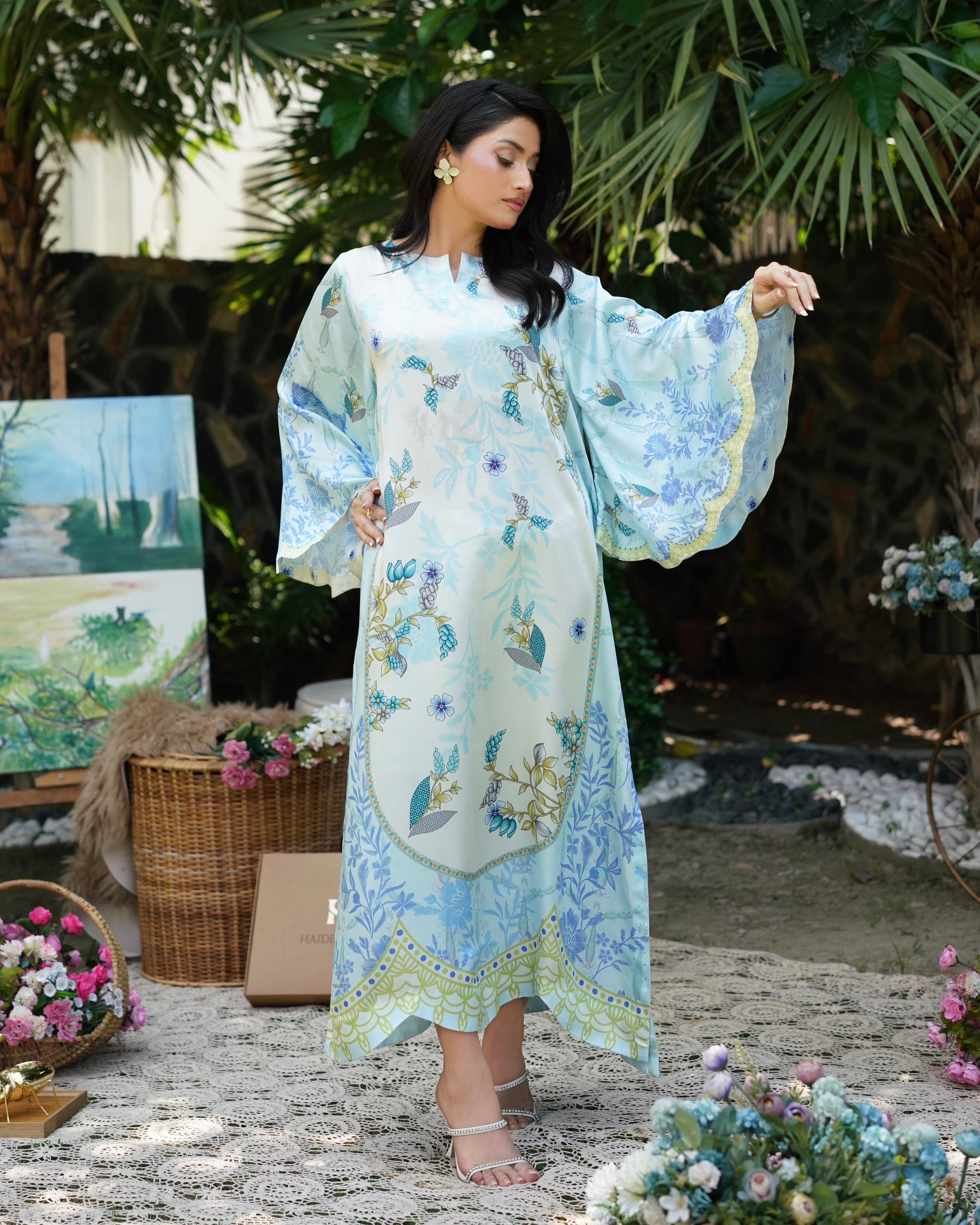 Breezy and beautiful, Skydew is a long kaftan cut in a relaxed silhouette, featuring scalloped batwing sleeves and a scalloped hemline for added flair. Printed in soft shades of sky blue, ivory, and lime, the outfit blooms with fresh botanical patterns, perfect for easy summer elegance. Lightweight, flowy, and effortlessly graceful — it’s your calm in color.