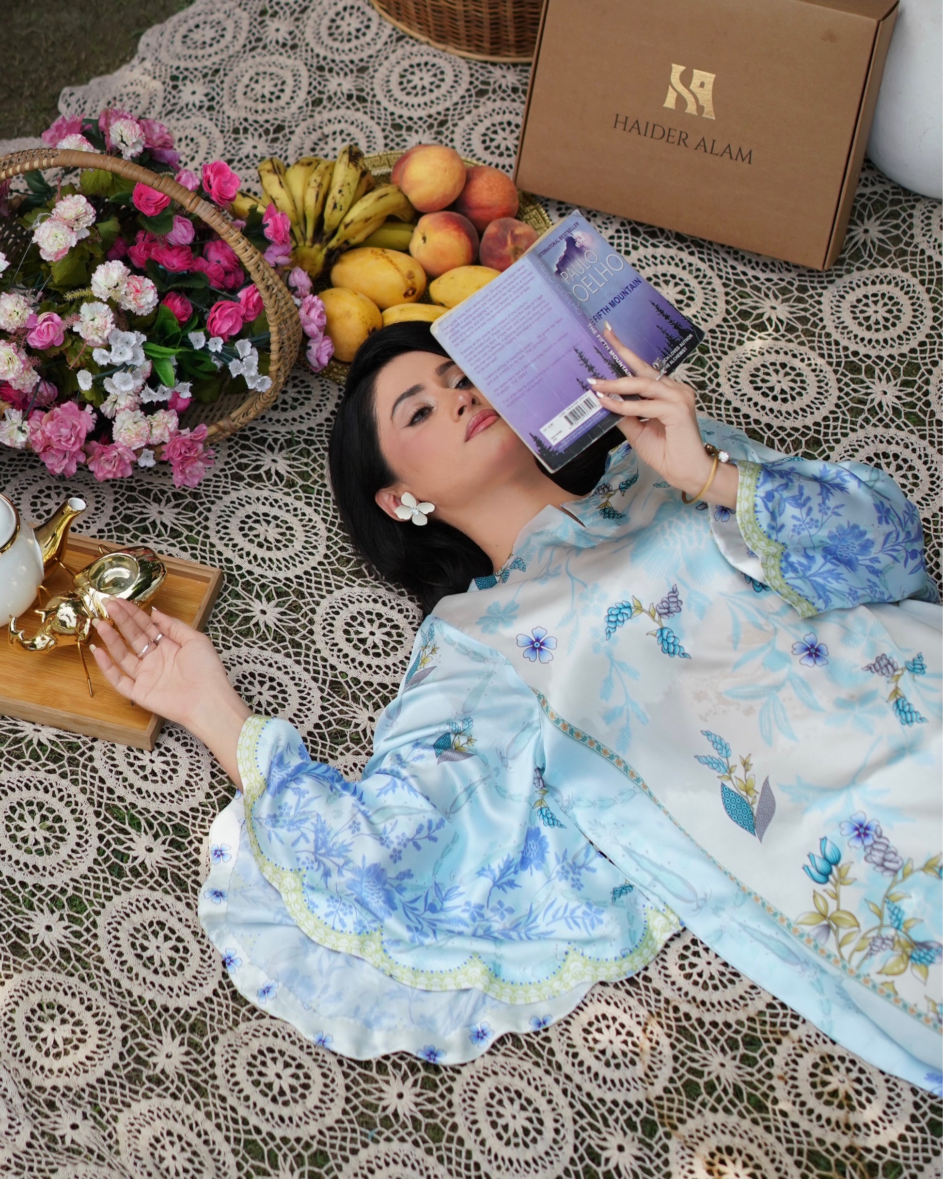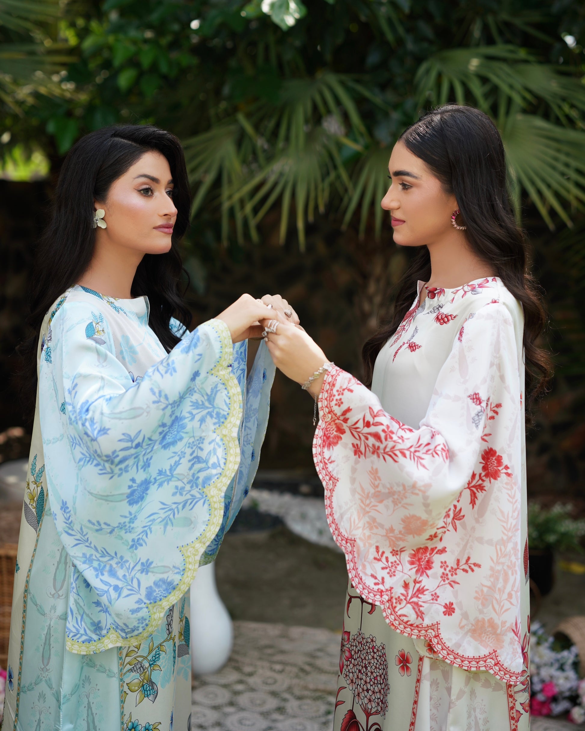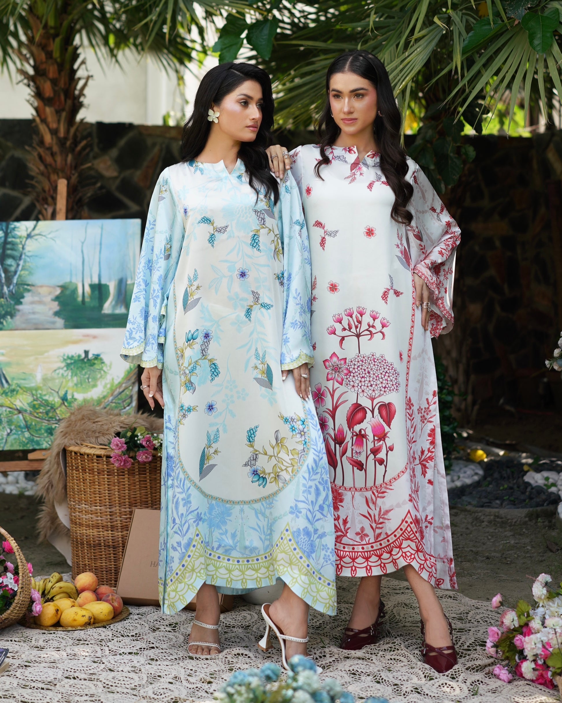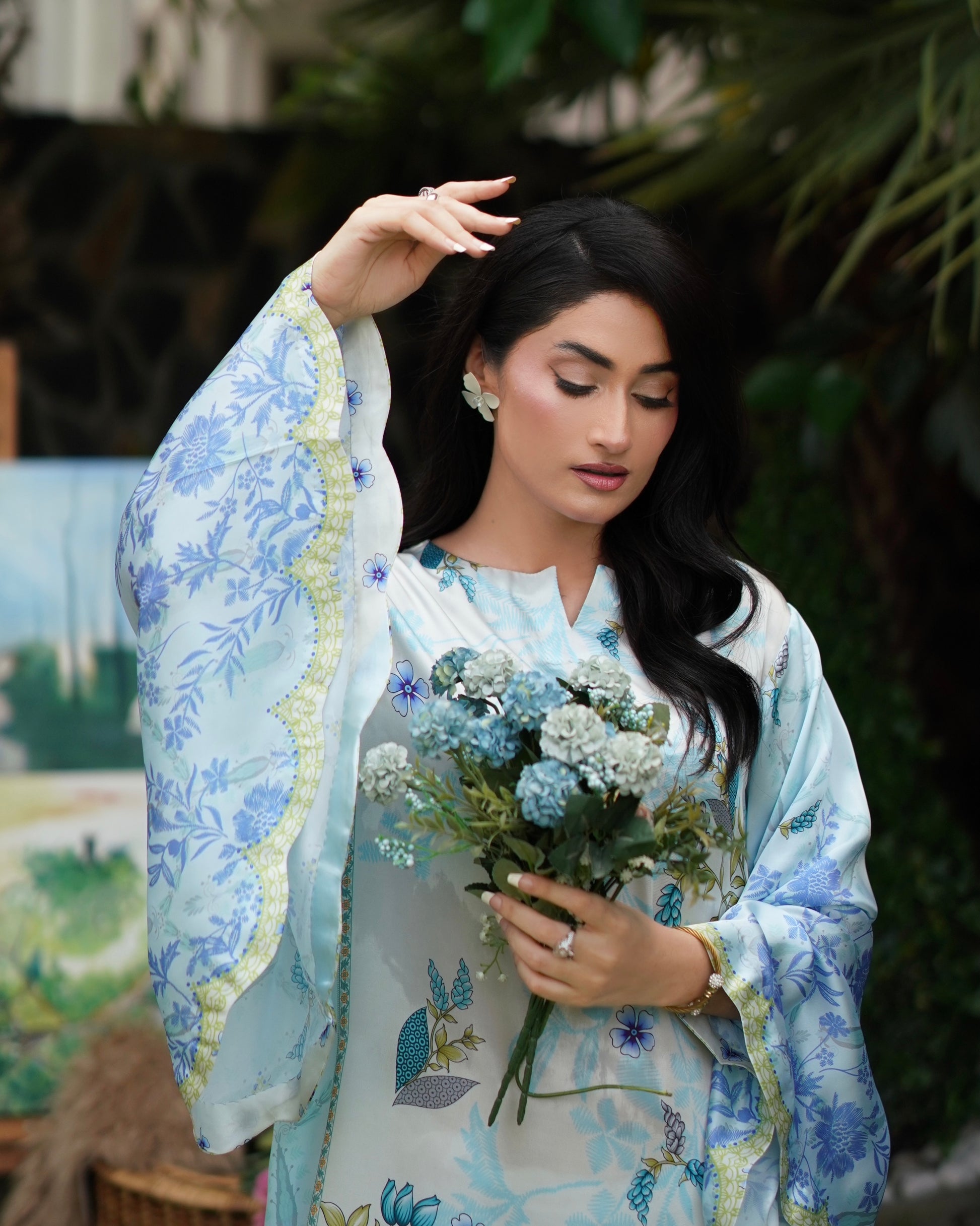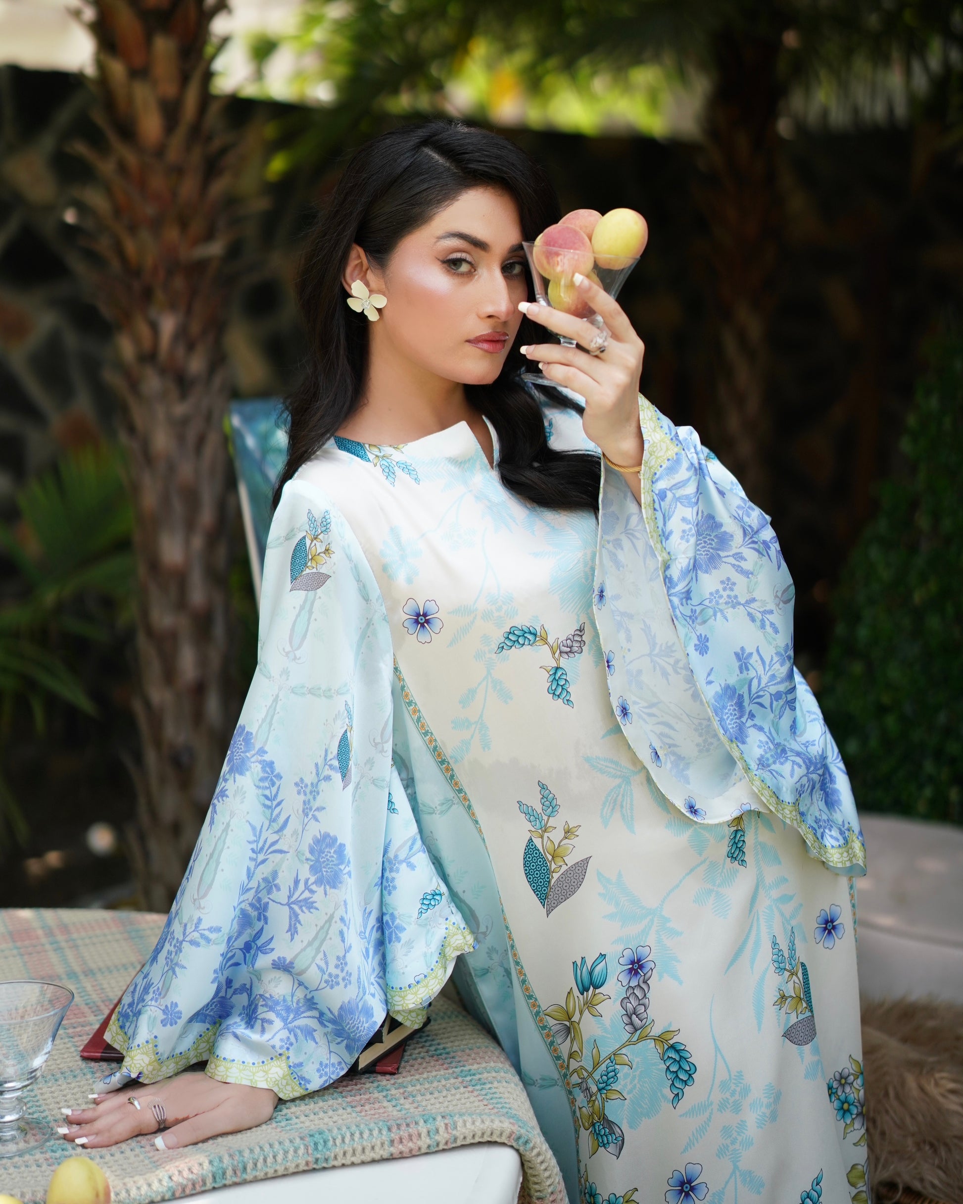 Breezy and beautiful, Skydew is a long kaftan cut in a relaxed silhouette, featuring scalloped batwing sleeves and a scalloped hemline for added flair. Printed in soft shades of sky blue, ivory, and lime, the outfit blooms with fresh botanical patterns, perfect for easy summer elegance. Lightweight, flowy, and effortlessly graceful — it’s your calm in color.